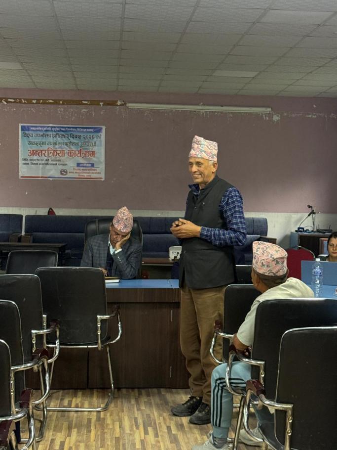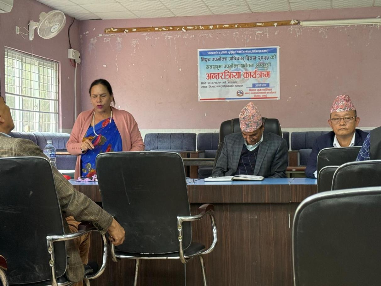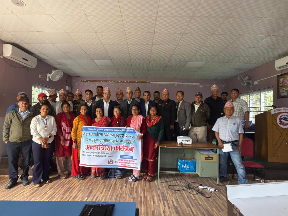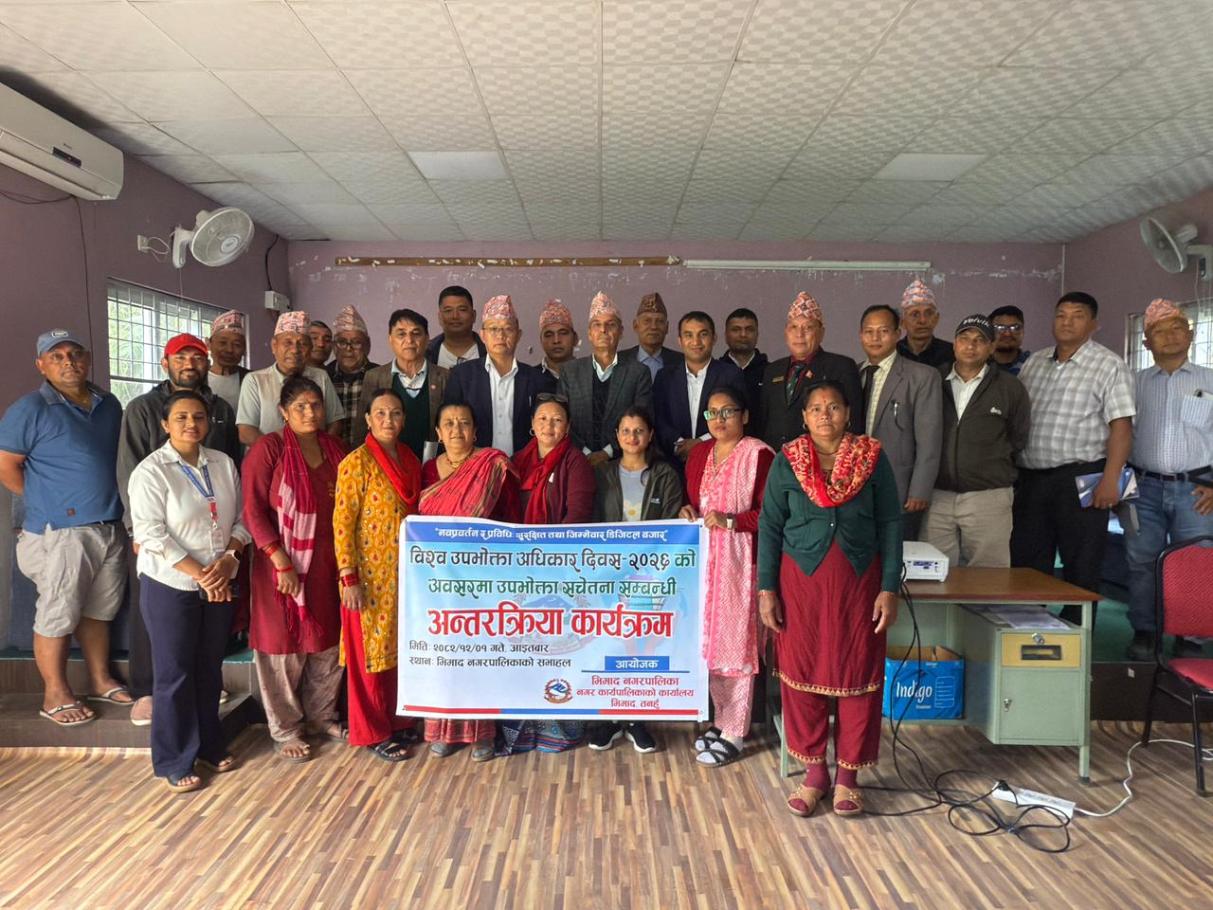 मिति २०८२ साल चैत्र १ गते तदअनुरुप २०२६ मार्च १५ गते विश्व उपभोक्ता अधिकार दिवसको उपलक्ष्यमा भिमाद नगरपालिकाको आयोजनामा एक दिने उपभोक्ता सचेतना कार्यक्रम सम्पन्न भयो।कार्यक्रममा टोलविकास संस्था, आमा समूह, जलउपभोक्ता संस्था, सहकारी संस्थाका प्रतिनिधि गरी 33 जनाको सहभागिता रहेको थियो। भिमाद नगरपालिकाको उपप्रमुख श्री शारादा खनालको अध्यक्षता , नगर प्रमुख श्री दधिराज सुवेदीको प्रमुख आतिथ्यतामा संचालन गरिएको कार्यक्रममा तनहुँ जिल्लाका सहायक प्रमुख जिल्ला अधिकारी श्री दिपक रेग्मीले उपभोक्ता संरक्षण ऐन, २०७५ का मूख्य प्रावधानको विषयमा सहजीकरण गर्नुभएको थियो भने कृषि प्रसार अधिकृत सुस्मिता गौतमले कृषिजन्य उत्पादन र उपभोगमा उपभोक्ताले अपनाउनुपर्ने विषयमा र जनस्वास्थ्य अधिकृत श्री सुनिता धरेलले औषधीजन्य सामाग्रीको बिक्री वितरणमा उपभोक्त्ताले ख्याल गर्नुपर्ने विषयमा जानकारी गराउनु भएको थियो। कार्यक्रममा प्रमुख प्रशासकीय अधिकृत कमलप्रसाद पुनले कार्यक्रमको उद्देश्य र महत्व बारेमा प्रकाश पार्नुभएको थियो। कार्यक्रमको व्यवस्थापन सहायक आलेप अधिकृत श्री चिरन्जीवी सिग्देलले गर्नुभएको थियो भने उद्घोषकको भूमिका प्रशासकीय अधिकृत अजय सुवेदीले गर्नुभएको थियो। सोही कार्यक्रमका केही झलकहरु............