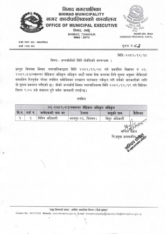 विज्ञापन नं ०६- २०८२/०८३ (स्वास्थ्य) मेडिकल अधिकृत पदको अन्तर्वार्ताको मिति तोकिएको सम्बन्धमा