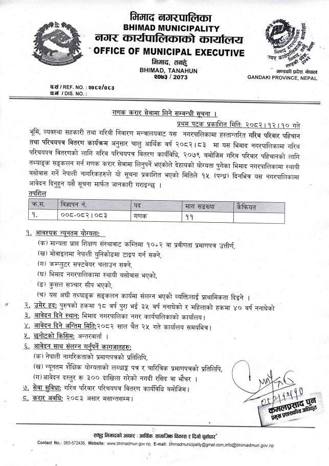 विज्ञापन नं ८ : गणक करार सेवामा लिने सम्बन्धमा ( गरिब परिवार पहिचान कार्यक्रम )