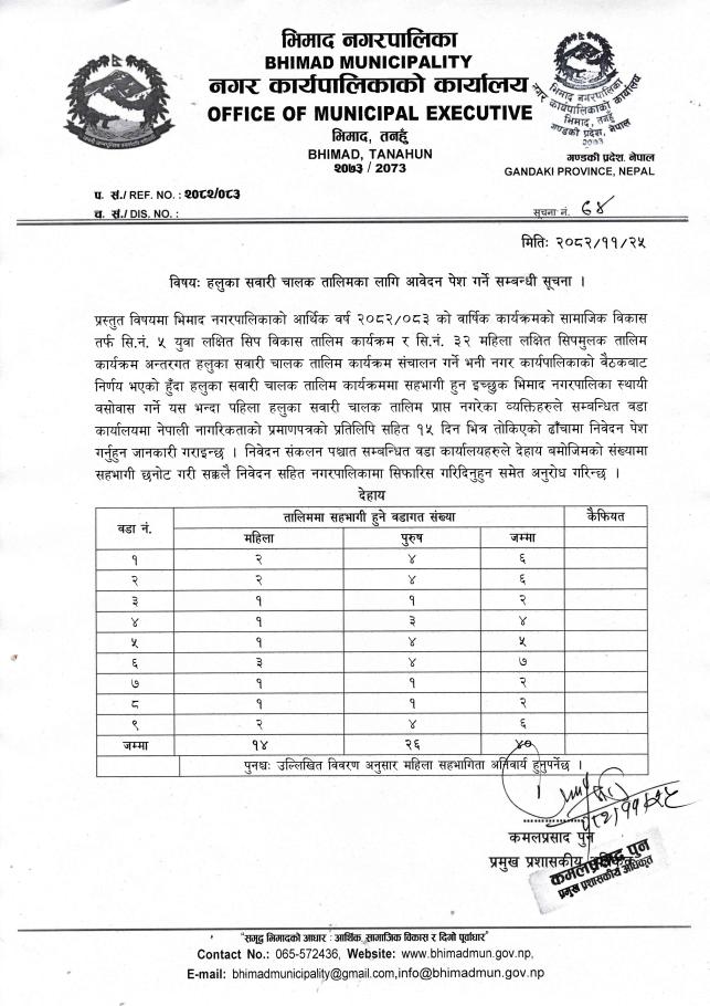 हलुका सवारी चलाक तालिमका लागि आवेदन पेश गर्ने सम्बन्धी सूचना