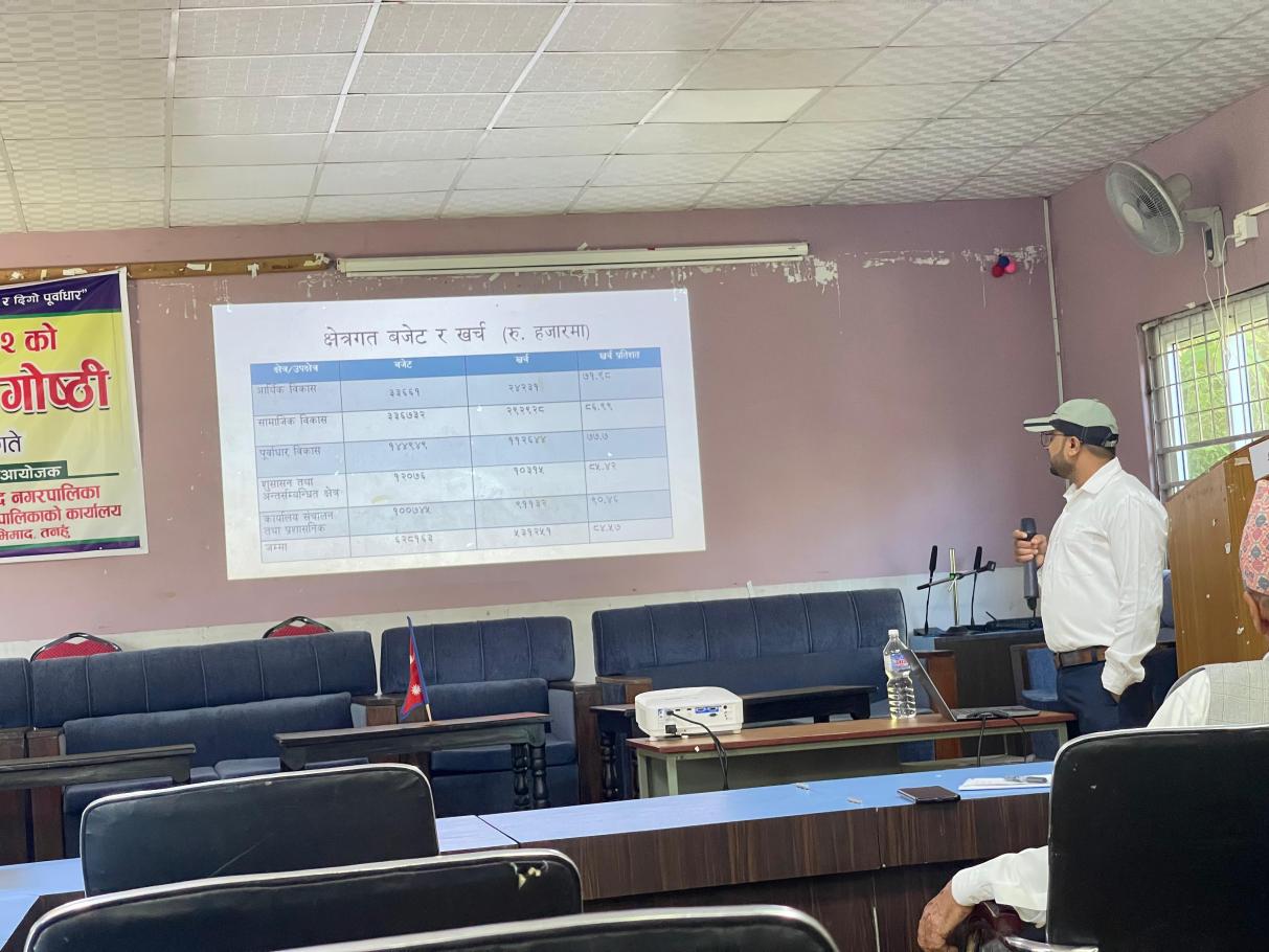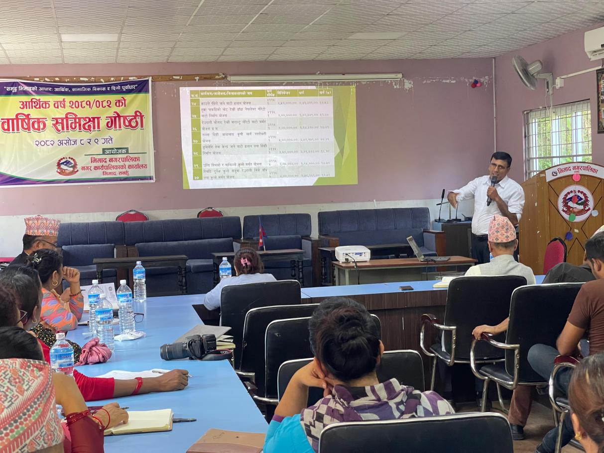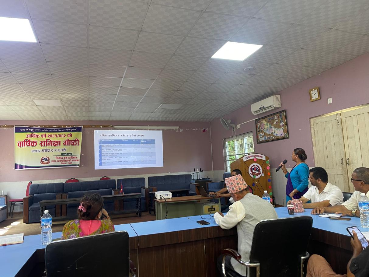 मिति २०८२/०६/०८ र ०९ गतेको दिन श्रद्वेय नगर प्रमुख श्री दधिराज सुवेदी ज्यूको अध्यक्षतामा, नगर उप प्रमुख श्री शारदा खनाल ज्यू र प्रमुख प्रशासकीय अधिकृत श्री कमलप्रसाद पुन ज्यूको विशेष अतिथ्यता, वडा अध्यक्षज्यूहरु, कार्यपालिका सदस्य ज्यूहरु, शाखा प्रमुख ज्यूहरु तथा कर्मचारीहरुको उपस्थितिमा आर्थिक वर्ष २०८१/८२ को वार्षिक समीक्षा कार्यक्रम सम्पन्न भएको छ । गत आर्थिक वर्षको समीक्षा गर्दै अगामी आर्थिक वर्षको कार्ययोजना बनाउने उद्देश्यले आयोजना गरिएको उक्त कार्यक्रममा सम्पूर्ण वडा र विषयगत शाखाबाट आर्थिक वर्ष २०८१/८२ मा सम्पादित कार्यक्रमहरुको प्रगति प्रतिवेदन प्रस्तुत गरिएको थियो ।