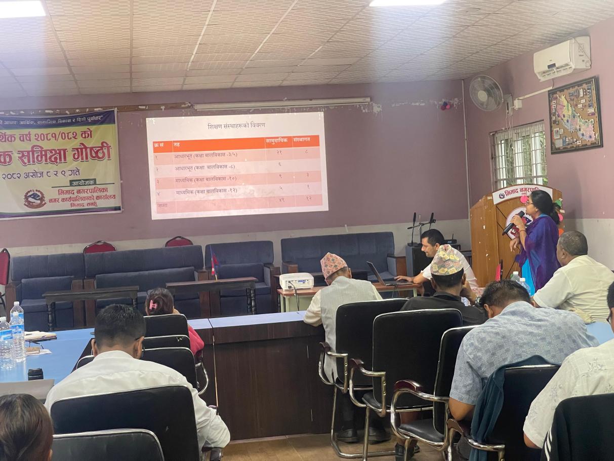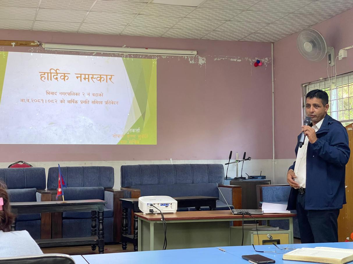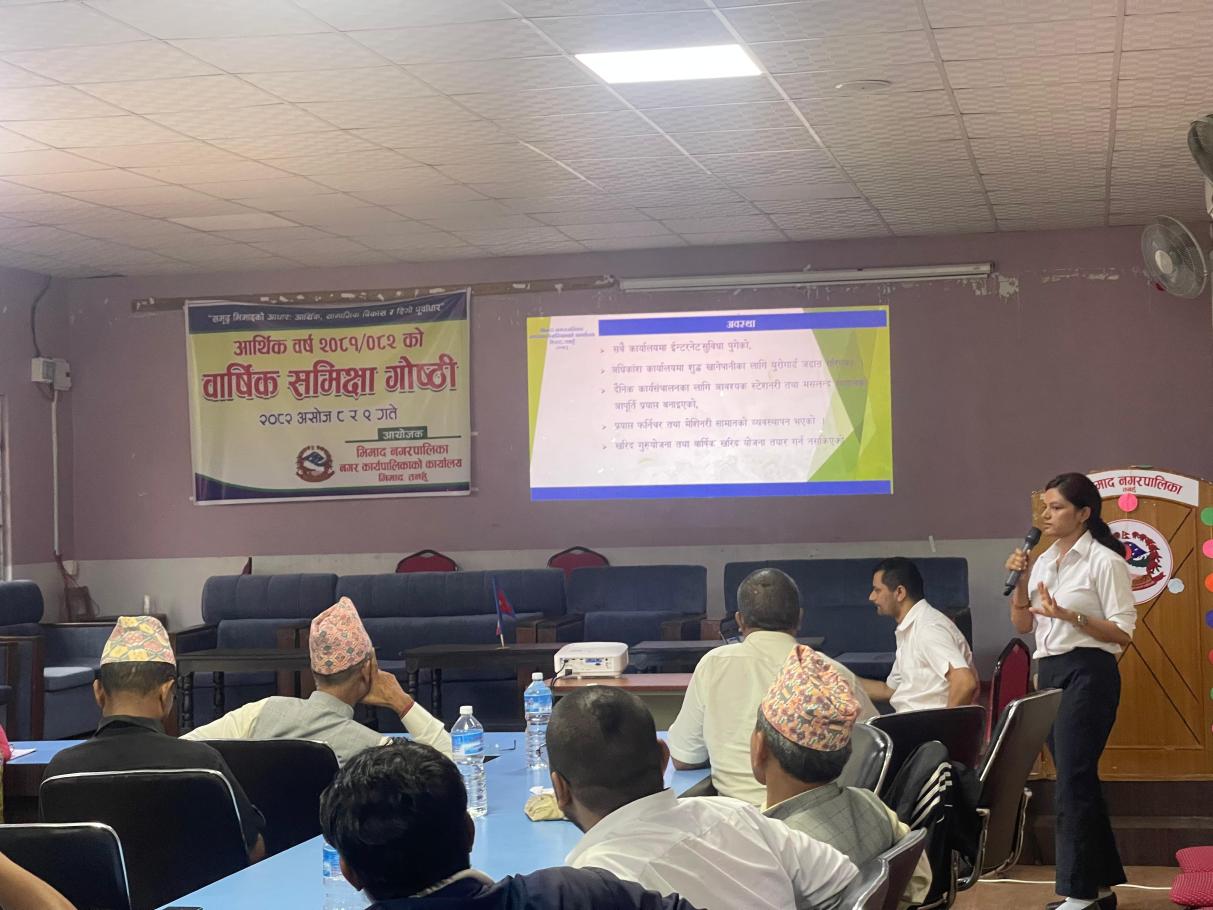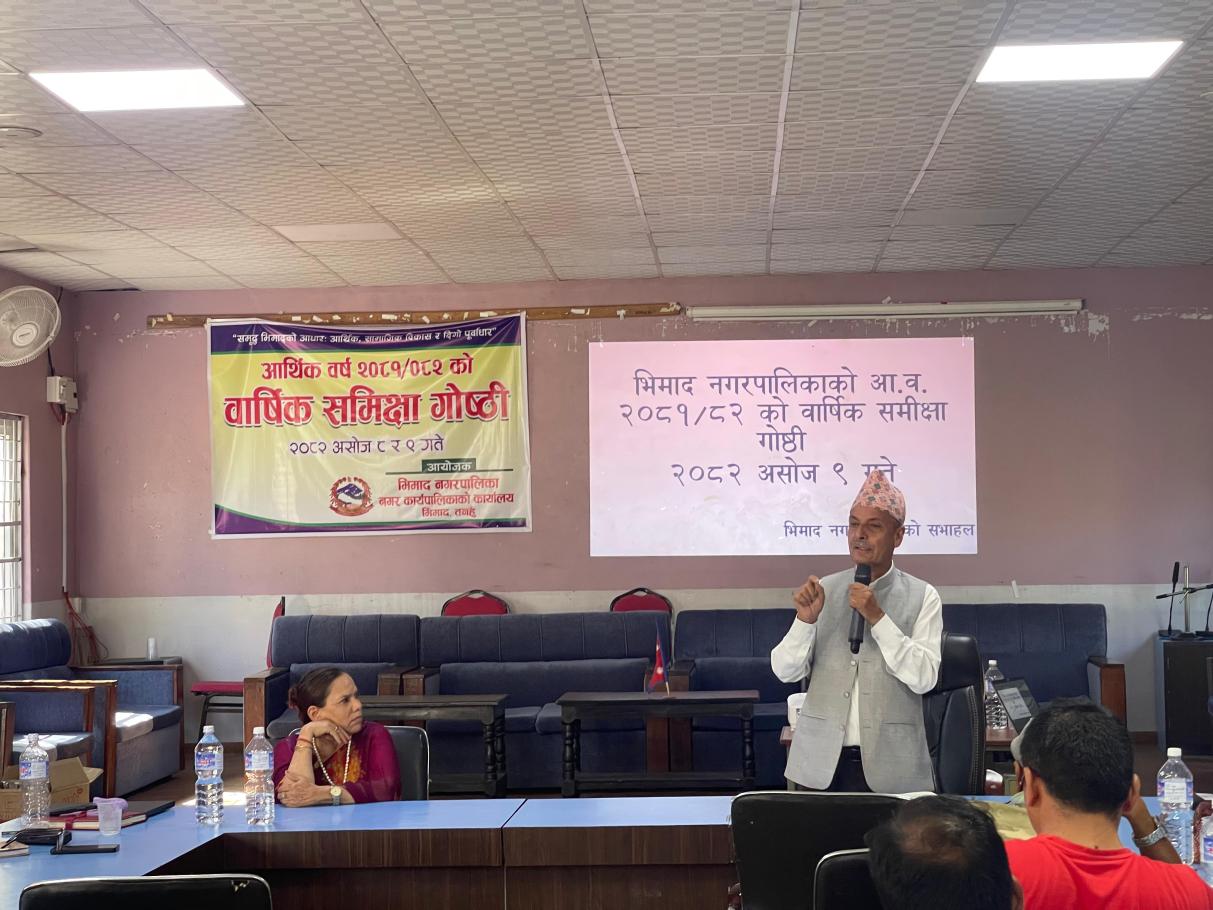 मिति २०८२/०६/०८ र ०९ गतेको दिन श्रद्वेय नगर प्रमुख श्री दधिराज सुवेदी ज्यूको अध्यक्षतामा, नगर उप प्रमुख श्री शारदा खनाल ज्यू र प्रमुख प्रशासकीय अधिकृत श्री कमलप्रसाद पुन ज्यूको विशेष अतिथ्यता, वडा अध्यक्षज्यूहरु, कार्यपालिका सदस्य ज्यूहरु, शाखा प्रमुख ज्यूहरु तथा कर्मचारीहरुको उपस्थितिमा आर्थिक वर्ष २०८१/८२ को वार्षिक समीक्षा कार्यक्रम सम्पन्न भएको छ । गत आर्थिक वर्षको समीक्षा गर्दै अगामी आर्थिक वर्षको कार्ययोजना बनाउने उद्देश्यले आयोजना गरिएको उक्त कार्यक्रममा सम्पूर्ण वडा र विषयगत शाखाबाट आर्थिक वर्ष २०८१/८२ मा सम्पादित कार्यक्रमहरुको प्रगति प्रतिवेदन प्रस्तुत गरिएको थियो ।