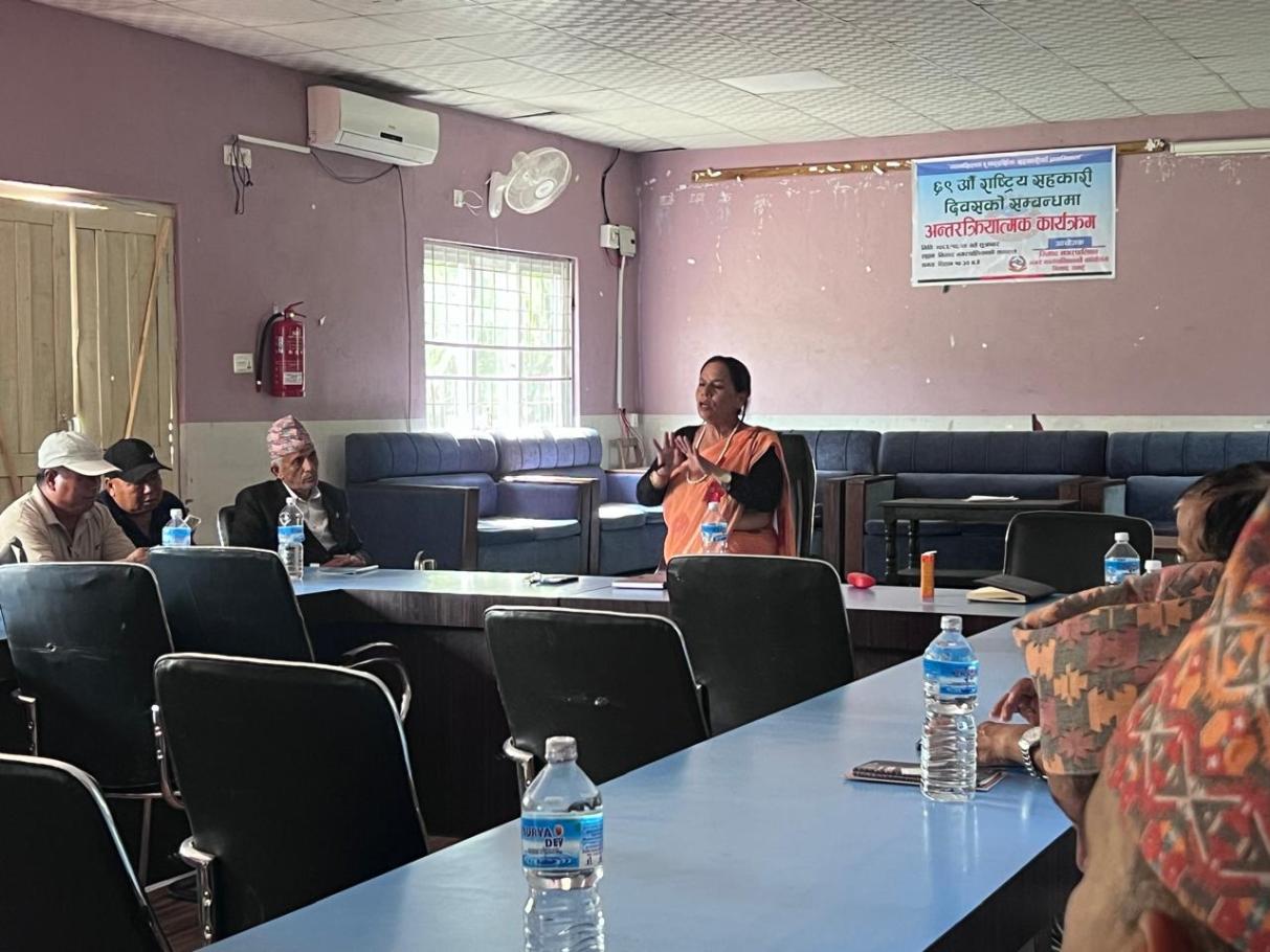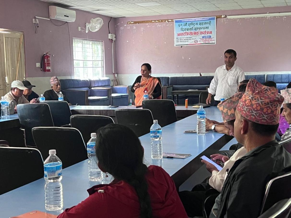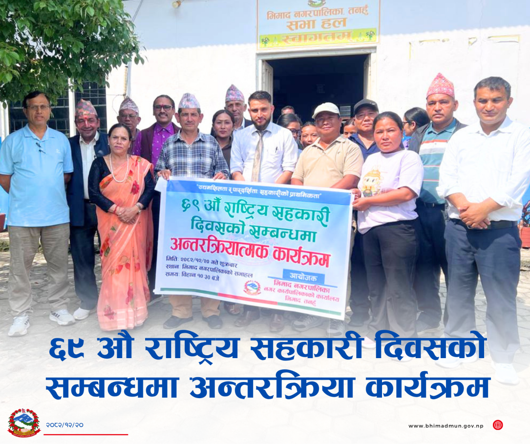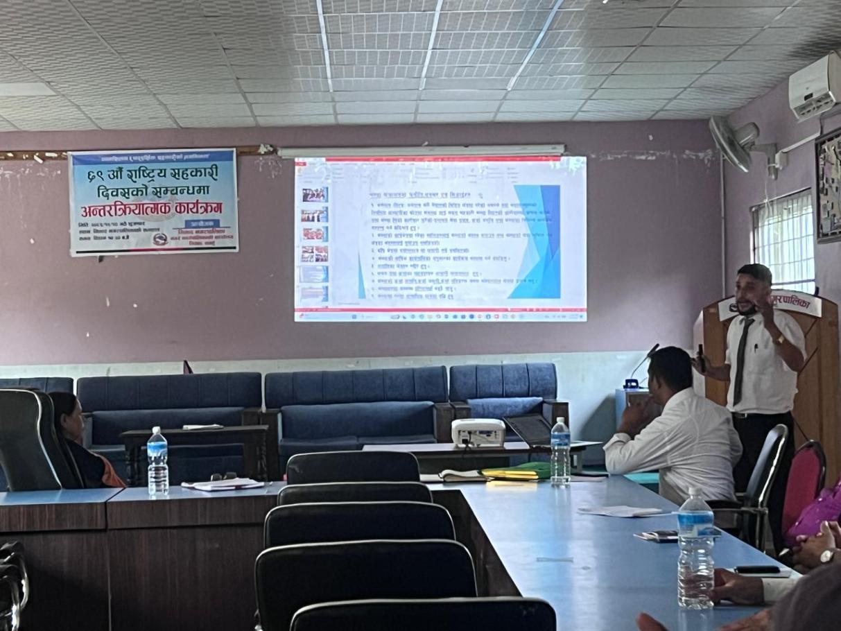 ६९औँ राष्ट्रिय सहकारी दिवसको सम्बन्धमा अन्तरक्रिया कार्यक्रम भिमाद नगरपालिका नगर उप-प्रमुख शारदा खनालज्यू को अध्यक्षतामा र प्रशासकीय अधिकृत अजय सुवेदी ज्यू को संयोजकत्वमा सम्पन्न