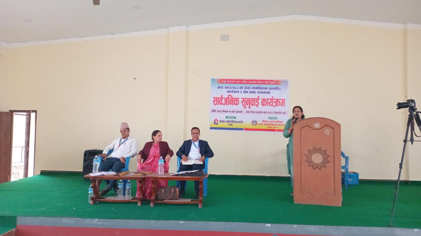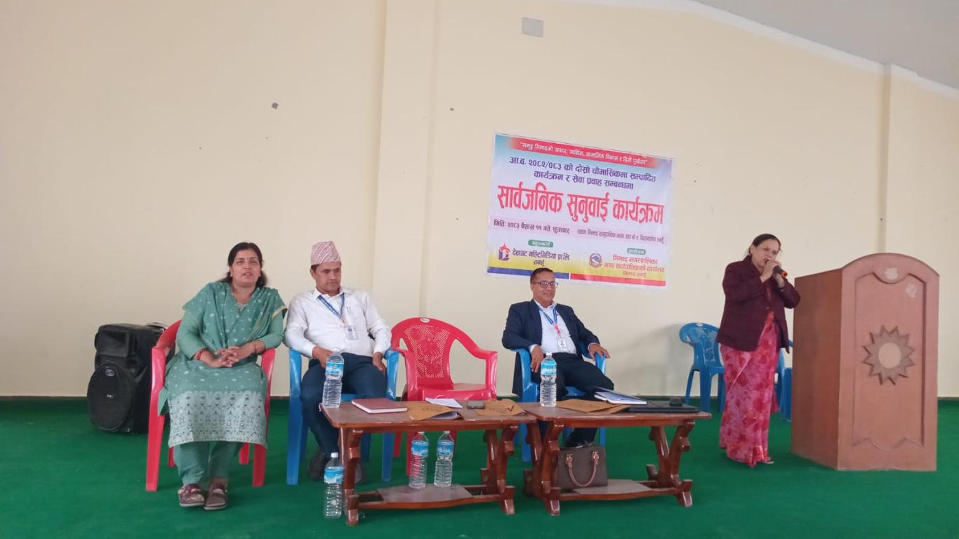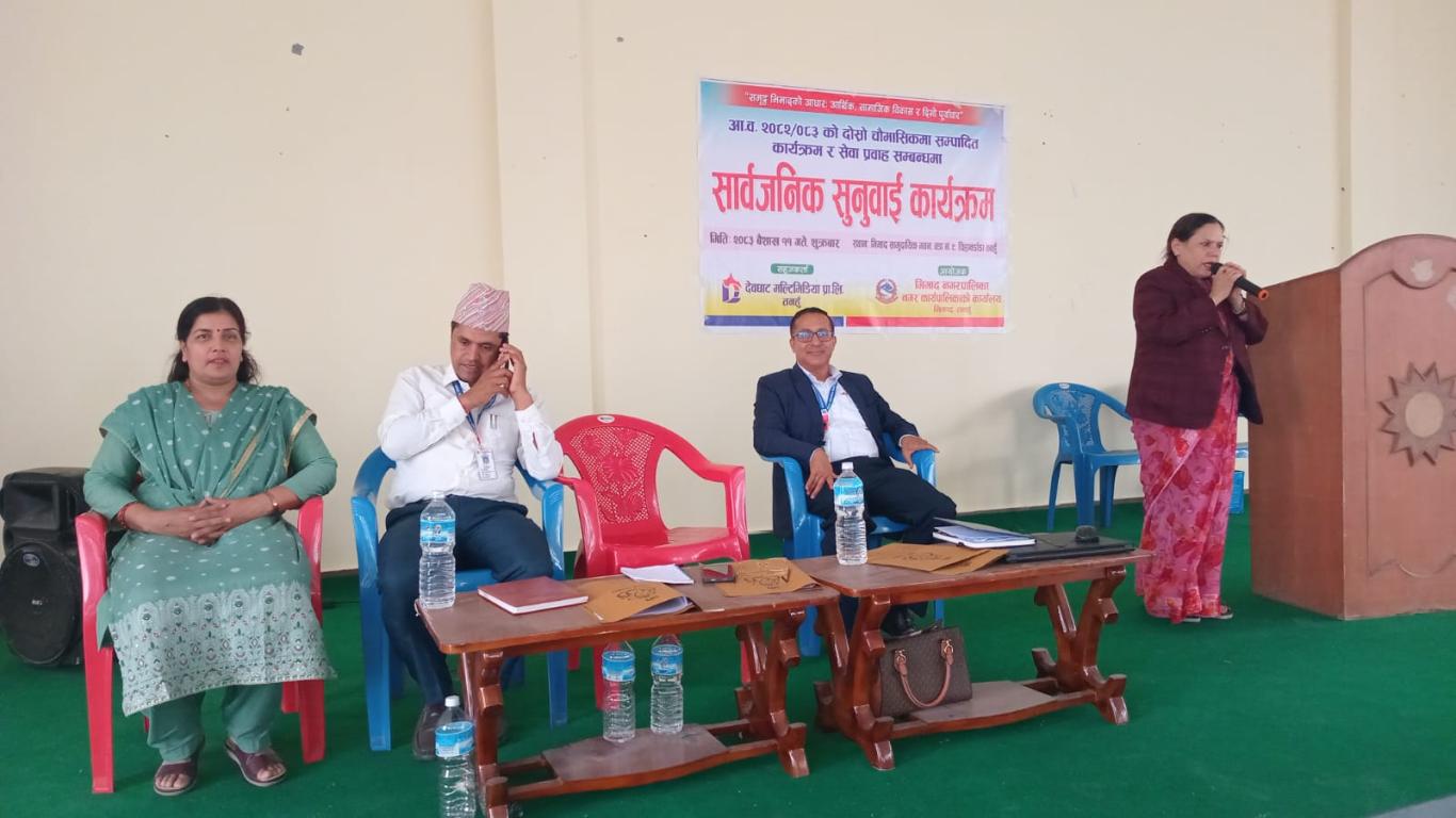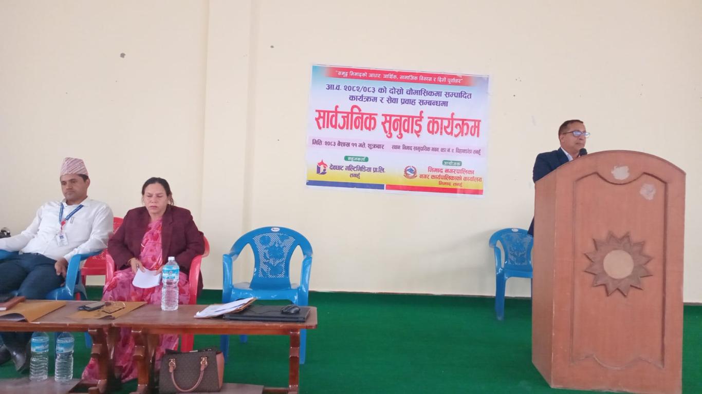 भिमाद नगरपालिकाको आयोजना र देवघाट मल्टिमिडिया प्रा.लिको सहकार्यमा मिति २०८३/०१/११ गते भिमाद नगरपालिकाद्वारा आर्थिक वर्ष २०८२/०८३ को दोश्रो चौमासिकमा सम्पादित विकास निर्माण , आर्थिक, सामाजिक विकास तथा सेवा प्रवाह सम्बन्धमा आयोजित सार्वजनिक सुनुवाई कार्यक्रम भिमाद नगरपालिकाका श्रदेय नगर उप-प्रमुख शारदा खनाल ज्यूको अध्यक्षतामा , भिमाद नगरपालिकाका प्रमुख प्रशासकीय अधिकृत श्री शोभाखर पोखरेलज्यू ,वडाका अध्यक्ष ज्यूहरु, कार्यपालिका सदस्य ज्यूहरु, शाखा प्रमुख ज्यूहरु, कर्मचारीहरु तथा भिमाद नगरपालिकावासीको उपस्थितिमा सम्पन्न भएको छ ।